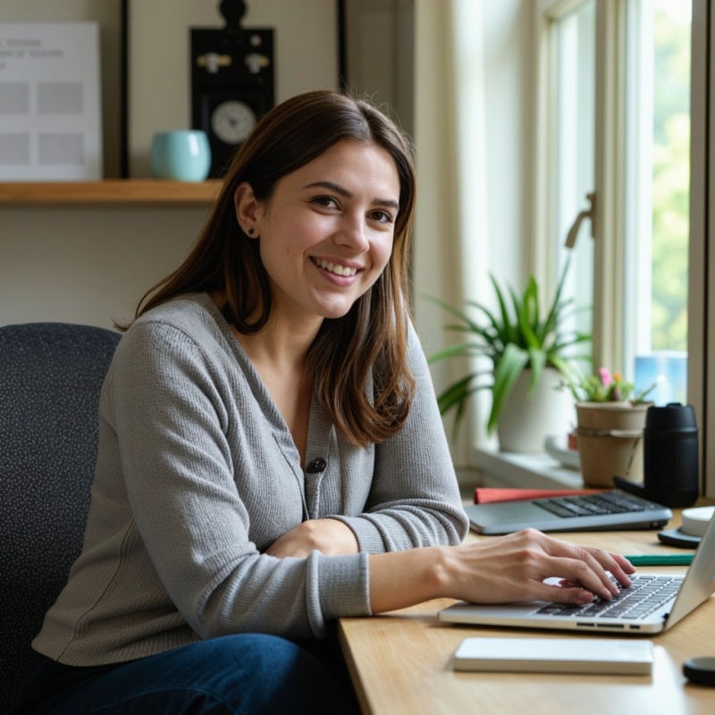 Maya modern office space, celebrating achievement during morning, with laptop and office supplies