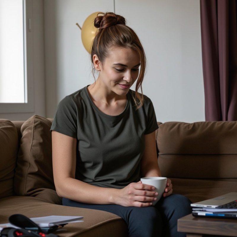 Elena comfortable home area, practicing hobby during morning, with hobby equipment and project materials